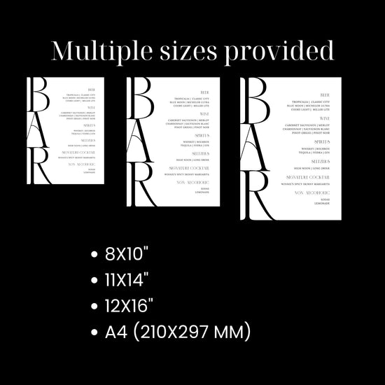 Introducing our modern, chic Wedding Bar Menu Sign Template in the Karla Collection. This Drink Menu signage features unique typography in a minimal design, a statement that will elevate your wedding bar to new heights of style and sophistication.